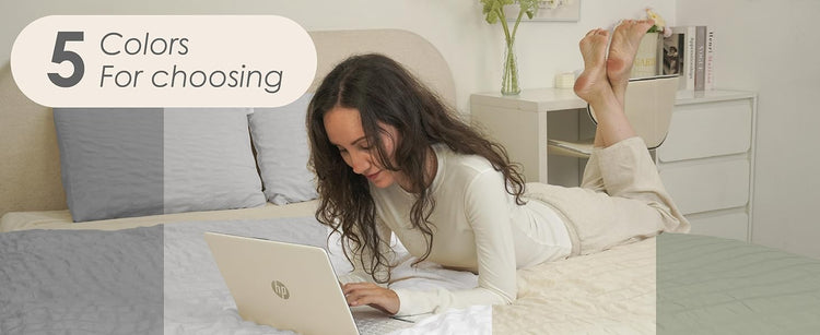• The front features a beautifully textured seersucker fabric that adds dimension and a chic, minimalist charm to your décor. The reverse side, made from smooth microfiber, ensures a soft, breathable feel that invites restful sleep in any season.