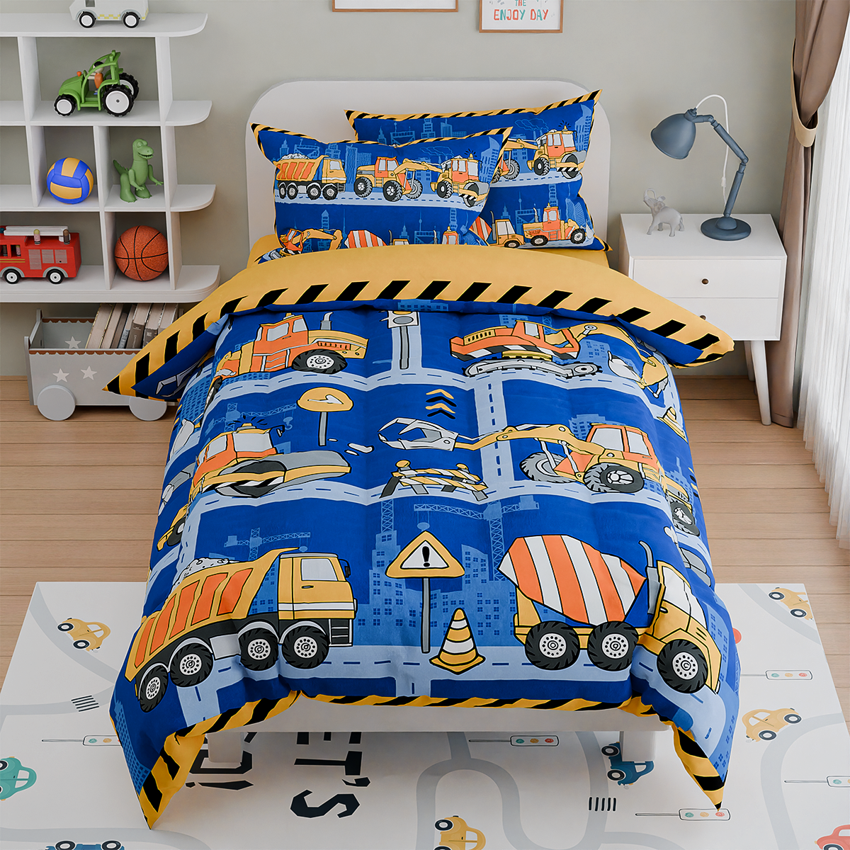 Introducing our delightful and cozy kid's bedding set, designed to transform any bedroom into a haven of comfort and imagination. Our products are made with ultra-comforting microfiber material, which is quite gentle on sensitive skin, ensuring that your little one will get a restful sleep and vibrant dreams. The set includes a comforter, a fitted sheet for mattress and one pillowcase. First up, the 68 x 86 inch comforter is the perfect blend of warmth and breathability, ensuring your child stays snug and cozy throughout the night. Next, the 39 x 75 x 14 inch fitted sheet effortlessly hugs the mattress, staying securely in place even during the most animated of bedtime adventures. Completing the set, our 20 x 30 inch pillowcase adds an extra touch of charm and comfort. With whimsical designs and vibrant colors, they're sure to spark your little one's imagination and make bedtime feel like a magical journey. Whether your child dreams of exploring distant galaxies or embarking on daring pirate adventures, our kid's bedding set is the perfect companion for their sleep escapades. To clean our bedding set, we recommend machine wash with cold water and tumble dry on low heat. Do not bleach or iron. Treat your little one to the ultimate bedtime experience with our kid's bedding set.