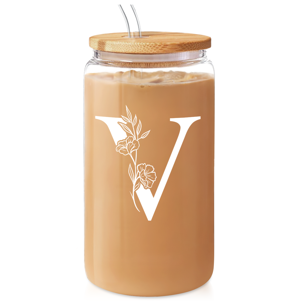 Monogram V Initial Glass Cup 16 Oz Can Coffee Cups with Lid and Straw - Gifts for Womens on Birthday