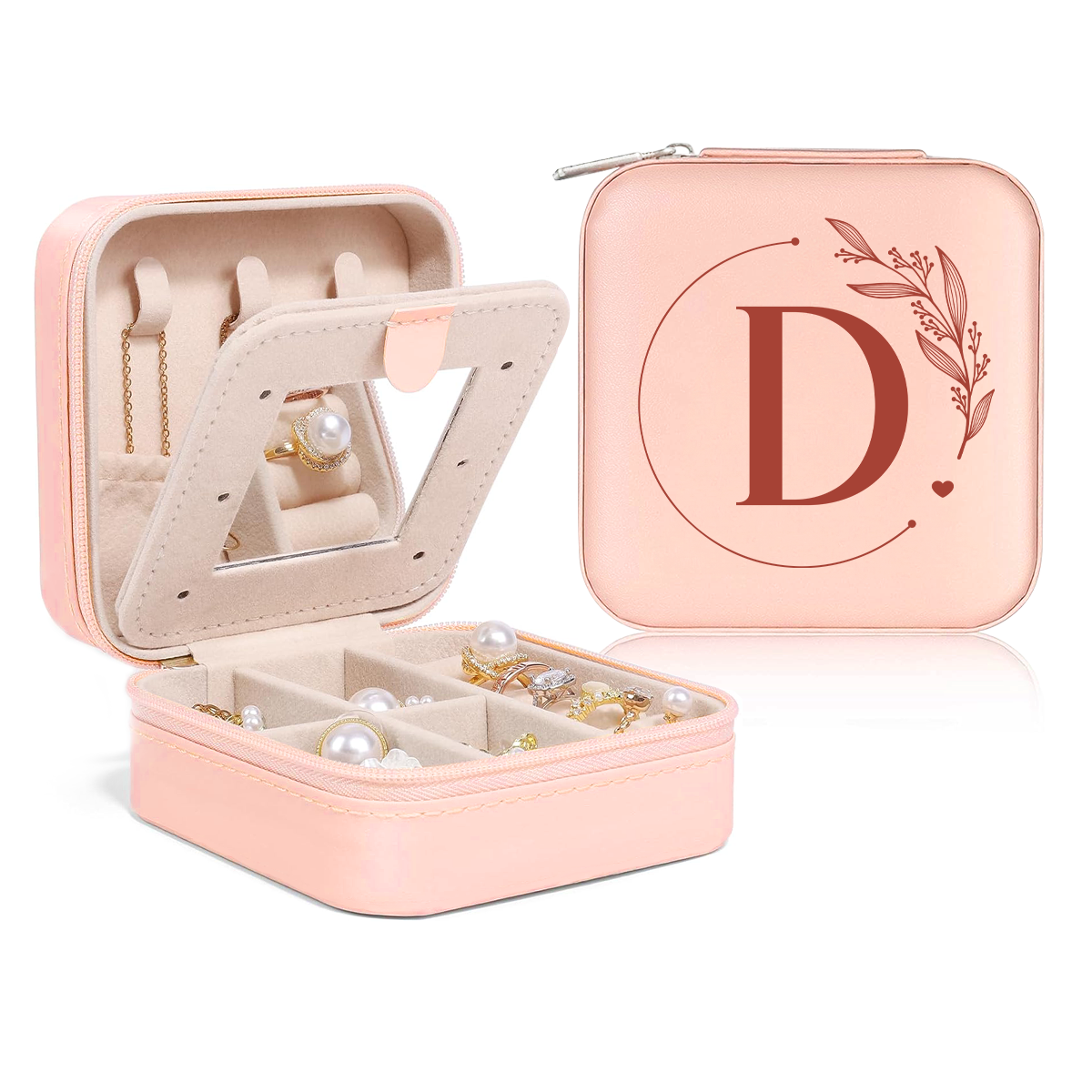 Personalized Jewelry Box, Pink Small Travel Jewelry Box with Initial D, Monogrammed Jewelry Case Organizer for Girls Women Teen, Mini Travel Essentials Gifts for Christmas Birthday