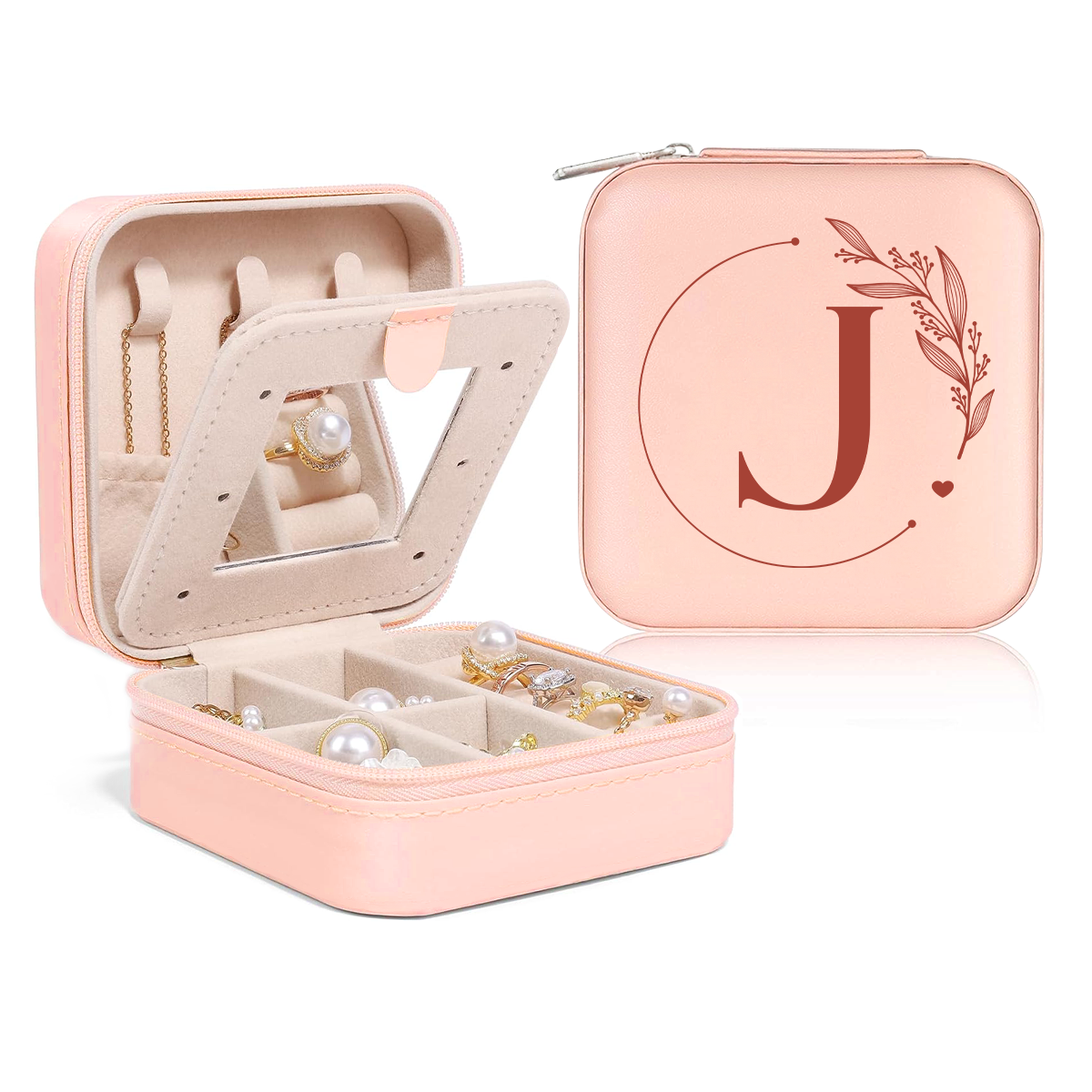 Personalized Jewelry Box, Pink Small Travel Jewelry Box with Initial J, Monogrammed Jewelry Case Organizer for Girls Women Teen, Mini Travel Essentials Gifts for Christmas Birthday
