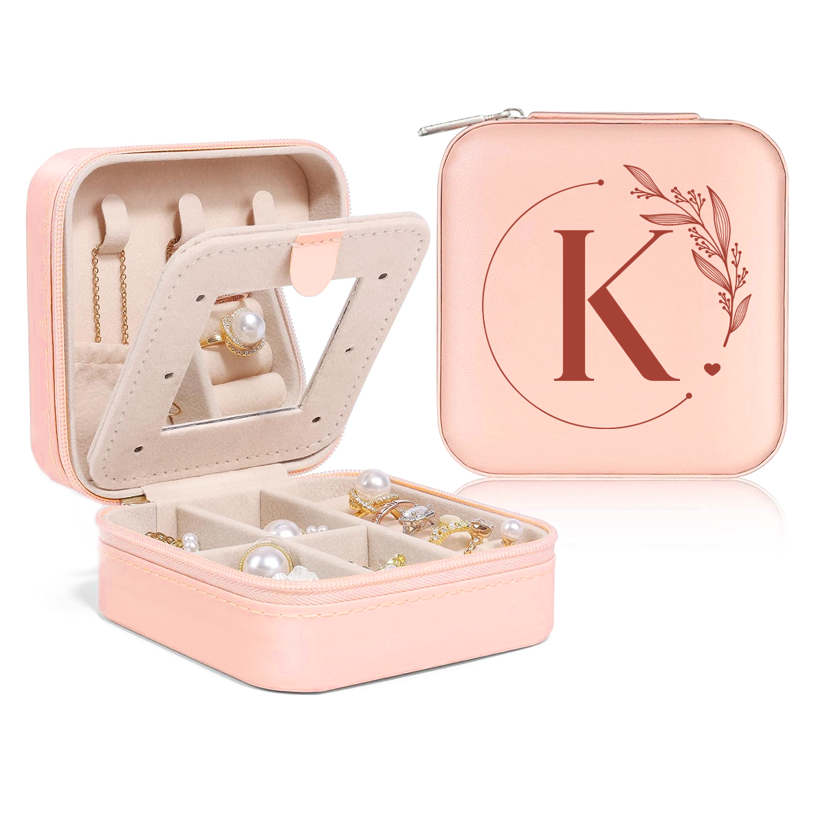 Personalized Jewelry Box, Pink Small Travel Jewelry Box with Initial K, Monogrammed Jewelry Case Organizer for Girls Women Teen, Mini Travel Essentials Gifts for Christmas Birthday
