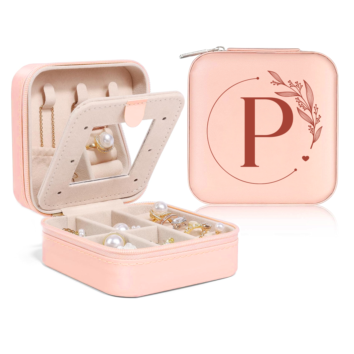 Personalized Jewelry Box, Pink Small Travel Jewelry Box with Initial P, Monogrammed Jewelry Case Organizer for Girls Women Teen, Mini Travel Essentials Gifts for Christmas Birthday