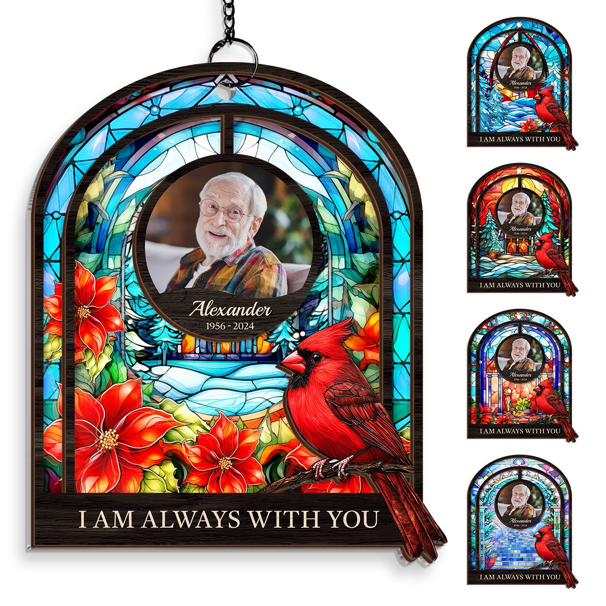 Personalized Memorial Suncatcher Ornament, Custom Photo Hanging Keepsake, Red Cardinal Loss of Loved Ones Sympathy Christmas Ornaments