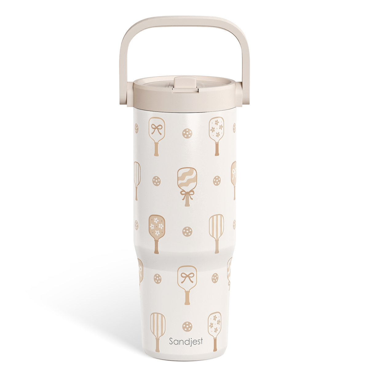 Pickleball Stainless Steel Straw Lid Tumbler 30oz with Carry Handle for Women Girls, Insulated Travel Coffee Cup, Gift for Sports Outdoor Workout Christmas Birthday (Beige)