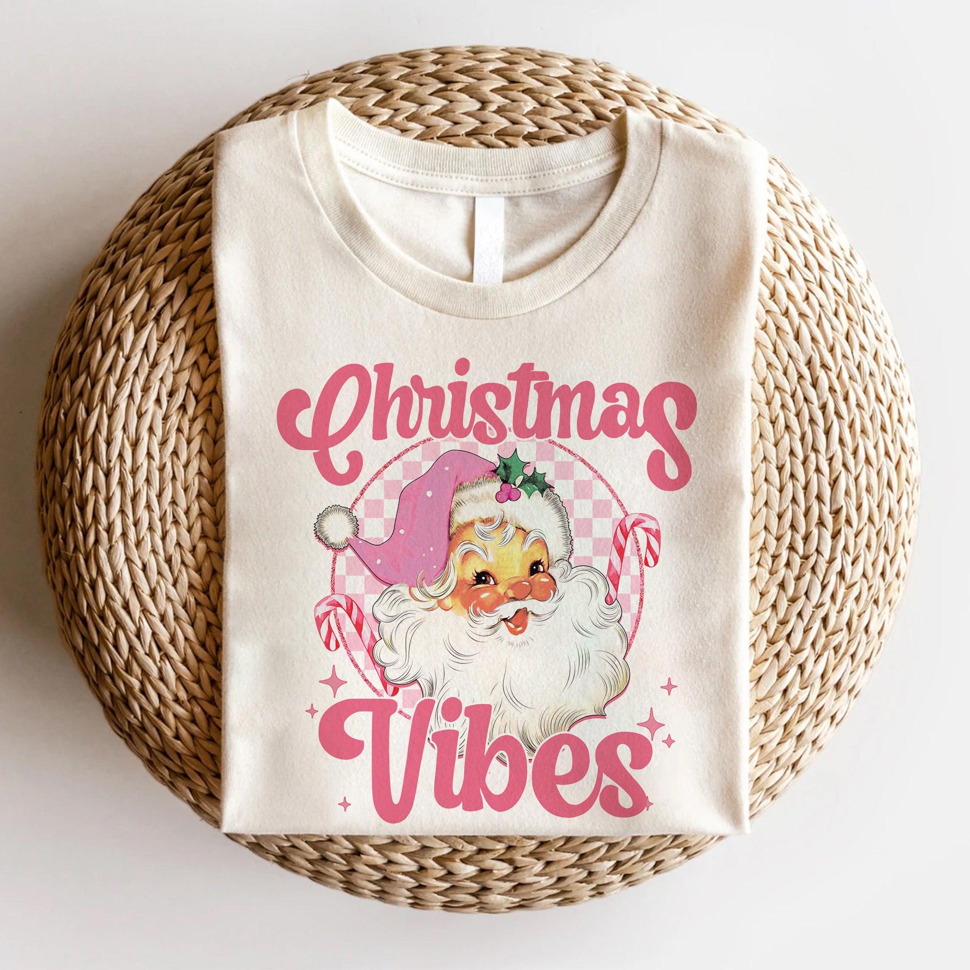 Sandjest-Christmas-Vibes-Retro-Shirt,-Groovy-Christmas-Santa-Tshirt,-Holiday-Apparel,-Vintage-Pink-Santa-Clause-Sweatshirt,-Vintage-Graphic-Tee