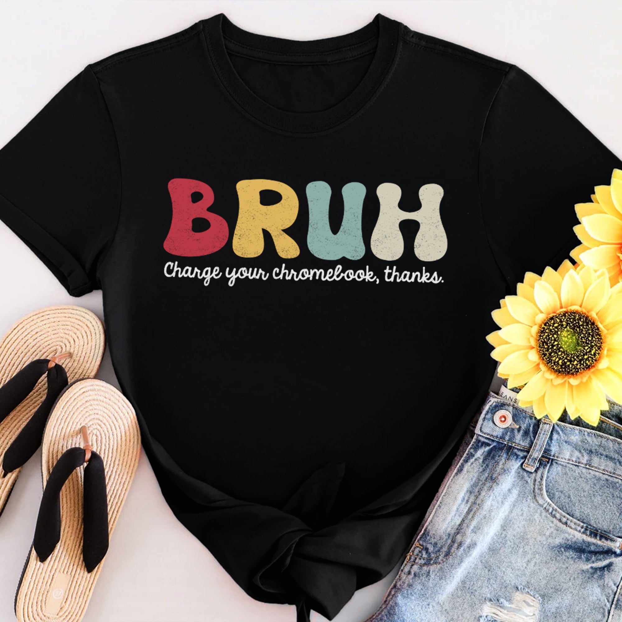 Sandjest Teacher T-Shirt Bruh Charge Your Chromebook Thanks Gift for Women Girl Friends